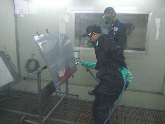 宋老師烤漆房?jī)?nèi)講解調(diào)校噴槍方法