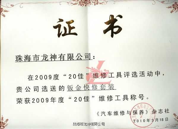 2010年北京汽保春季展期間,由中國(guó)汽車保修設(shè)備行業(yè)協(xié)會(huì)和《汽車維修與保養(yǎng)》雜志共同舉辦的2009年度“20佳”維修工具頒獎(jiǎng)典禮,于2010年3月18日在北京江河水鳥巢麗景隆重舉行,龍神“鈑金快修套裝”在眾多候選產(chǎn)品中脫穎而出,獲得本屆評(píng)審委員會(huì)專業(yè)評(píng)委的一致認(rèn)可:符合產(chǎn)品創(chuàng)新性、實(shí)用性、效率性,可幫助企業(yè)提高工作效率,授予“中國(guó)汽車維修市場(chǎng)2009年度20佳”榮譽(yù)稱號(hào)。