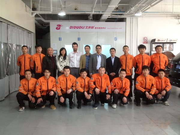 本司訊:2013年4月北京晴空萬里,龍神公司特邀英國專家一行五人,來到了北京車爵士進行汽車噴涂遮蔽技術交流。首先公司一行了解車爵士的汽車噴涂情況及詢問了使用的遮蔽工具情況。隨后英國專家針對在汽車噴漆時難噴涂的車門縫隙、玻璃死角等地方的專業(yè)遮蔽工具的演示。車縫泡沫膠:用于車身所有縫隙的遮蔽,有效隔離及遮蔽漆霧噴入車縫里。