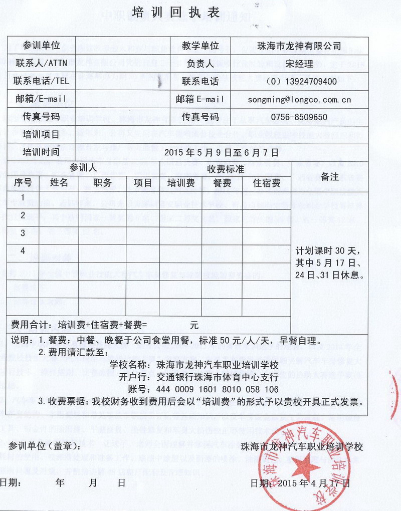 培訓(xùn)時(shí)間30天,即從2015年5月9日起至6月7日止,其中5月17日、24日31日休息;期間餐費(fèi)按照上課時(shí)間27天預(yù)收,實(shí)際參照離開時(shí)間調(diào)整。具體收費(fèi)情況請(qǐng)來電咨詢。