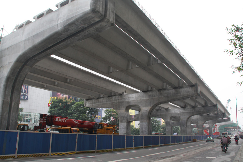 二環(huán)路東段改造工程路面施工,施工時(shí)間為2012年5月到2013年7月,投資為4.97億元,該工程北起二環(huán)路北府河橋東側(cè),向東經(jīng)商貿(mào)大道、火車北站、雙橋子立交,南止于二環(huán)路南府河橋東側(cè),全長13.1公里。為“連續(xù)高架快速路+地面城市主干路”,底層道路按照雙向6-8車道建設(shè),高架快速車道為雙向6車道,路面面積80.43萬m³。主要工程內(nèi)容包括:瀝青砼路面鋪裝(含噴砂打毛和防水層)、底層道路路面施工(含底基層、基層、面層、路緣石等附屬工程)