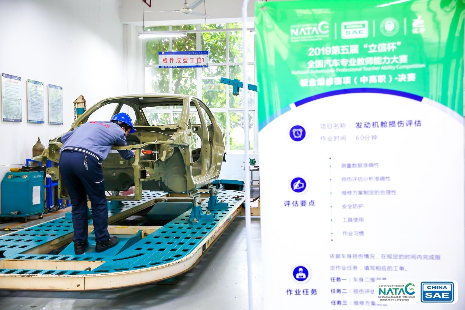 此次鈑金維修賽項分為N進36的選拔賽(微課制作)、36進4的預賽(項目是信息化教學說課、鋼制板件維修、模擬前縱梁更換維修)、決賽(項目是發(fā)動機艙損傷評估、信息化教學現(xiàn)場授課)。