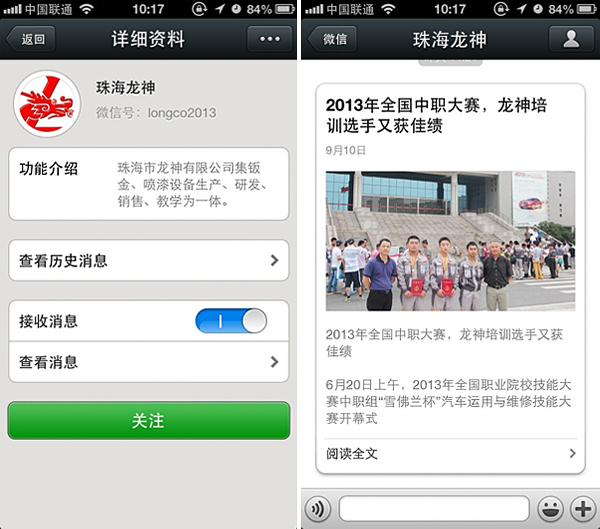珠海龍神官方微信敬請關注! 珠海市龍神有限公司公共微信號已申請成功,請大家多多關注! 掃描二維碼,也可直接搜索公眾微信號“珠海龍神” 我們將不定期發(fā)布公司最新資訊。 您也可以發(fā)消息和我們進行互動。 查看歷史消息收看您錯過的動態(tài)新聞,讓您第一手掌握最新動態(tài)。 2013-09-18 16750
